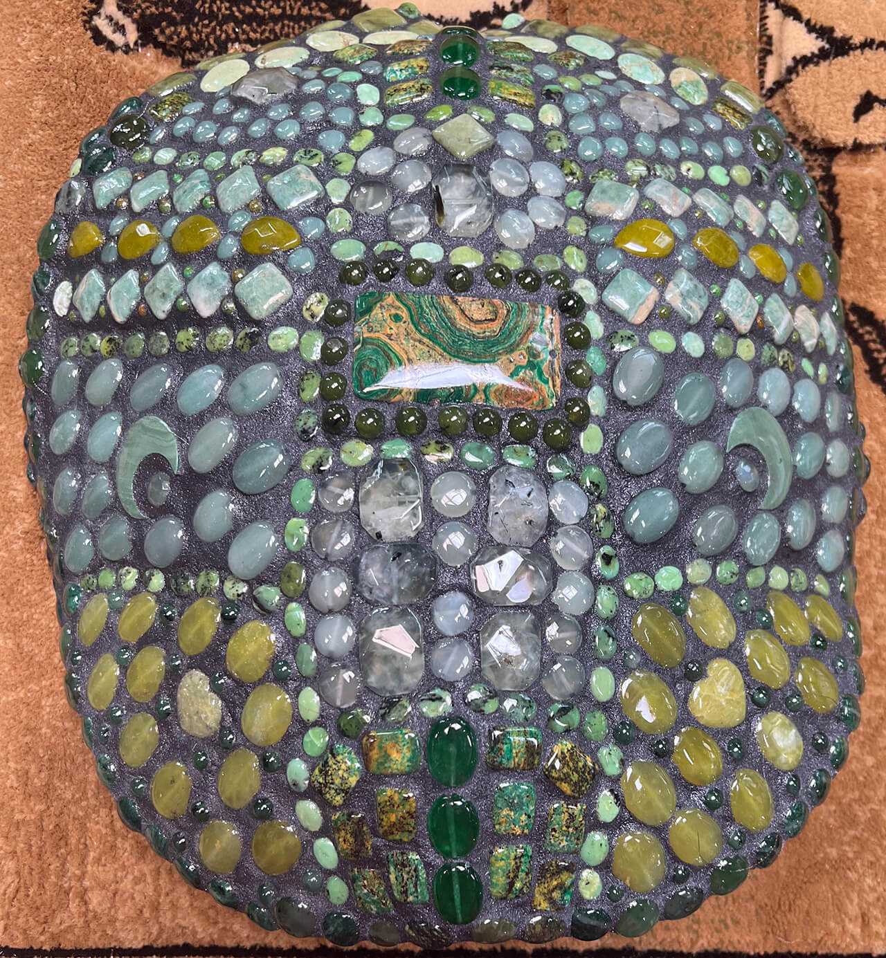 Turtle shell with kambaba jasper and agate This is a beautiful 11″ x 12” shell with a rectangle of kambaba jasper. All jasper and agate! Category: Past Turtle Shells Tag: Sold